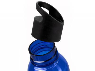 The RPET Bottle features a sleek, streamlined design with a matte black screw-on lid and integrated carry handle for easy portability. Available in clear, blue, or black, this bottle is BPA free, reusable, and designed for everyday use.