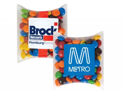 Custom printed pillow case filled with assorted M&M's. Pack holds 95 grams of milk chocolate M&M's packed in Pillow Pack. Assorted colours only. Statutory information label and distributor details adhered to pillow pack. Kids and adults – everyone loves chocolates! These high-quality promotional treats can be used in a variety of promotions and, with your artwork on them; they will be a tasty, yet a powerful reminder of you. A delicious way for people to get their mouth around your brand. Promotional M&Ms in Pillow Packs are really great for any promotional campaign: you can communicate to people of all ages, demographics and geographics! With these tasty promotional giveaways you can promote to anyone with a sweet tooth! Promotional M&Ms in Pillow Packs make excellent fundraisers, mailouts or handouts! They're a great tasty quality, and they look great. Promotional M&Ms in Pillow Packs make branding and customer relationship building easy!