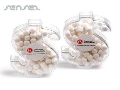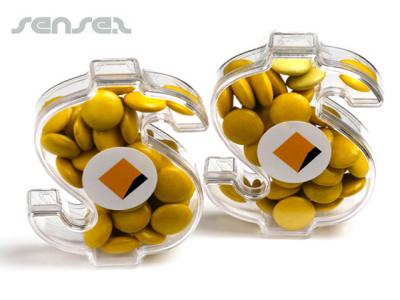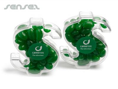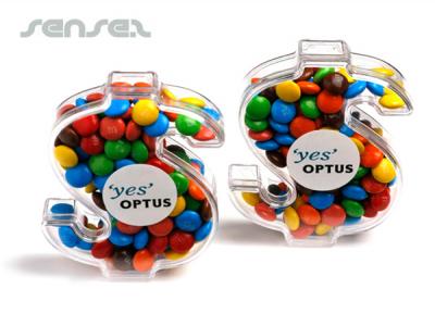 Dollar shaped box filled with your choice of coloured jelly beans, mixed or special colour choc beans, mints or mini m&m's. These dollar shaped clear acrylic containers are great for any money saving themed product promotions, mortgage companies or banks.
