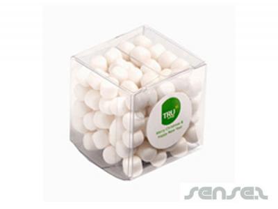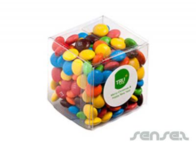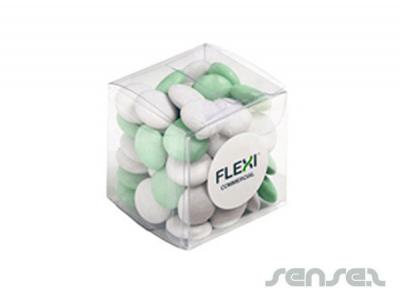 Custom printed lolly cubes in 60 grams sizes filled with either mints, chewy fruits, choc beans, jelly beans in corporate colours or m&m's.