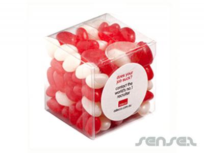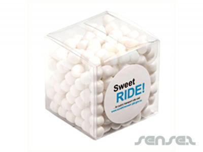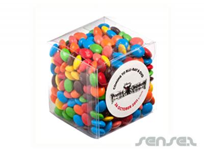 Custom printed lolly cubes in 110 grams sizes filled with either mints, choc beans, jelly beans in corporate colours or m&m's.
