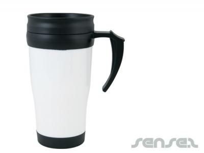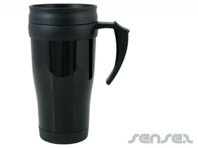 Custom printed promotional thermo travel mugs (450ml) are a double walled BPA free plastic construction that keeps beverages warmer for longer.