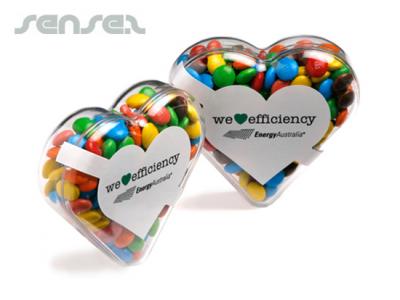 Heart shaped box filled with your choice of coloured jelly beans, mixed or special colour choc beans, mints or mini m&m's. These shaped clear acrylic containers are great for any "love" themed product promotions.