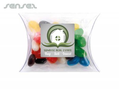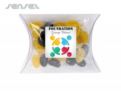 Our promotional confectionery pillows are clear boxes filled with your choice of confectionery and branded with your logo on a printed label. These pillows are a cute way of getting your brand noticed at trade shows and events! Clear Pillow Box filled with corporate colour Mini Jelly Beans and branded with a sticker are the perfect sweetener.
